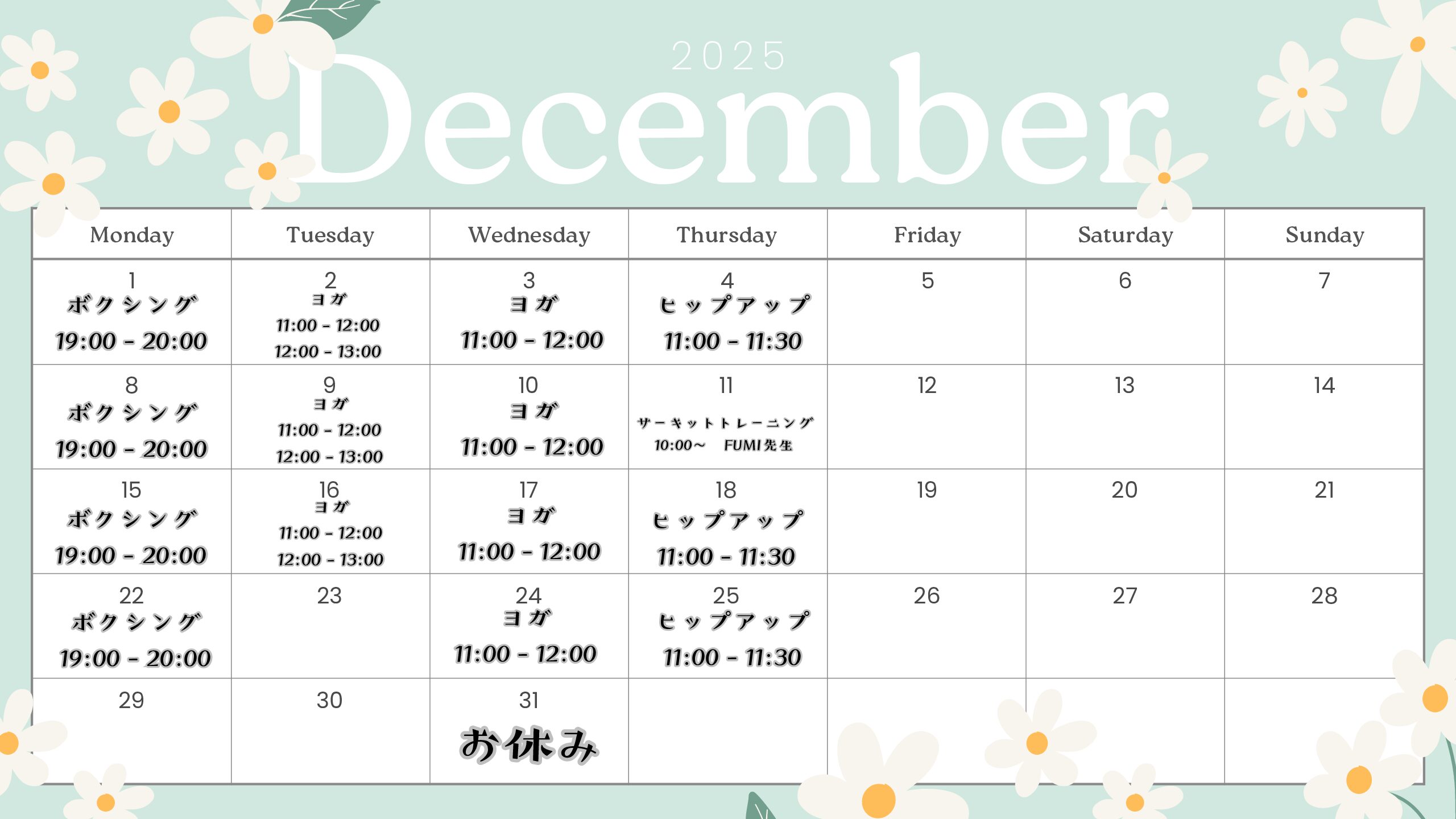 街がきらめくホリデーシーズン 美味しい誘惑も多い12月こそ、楽しく身体を動かしていきましょう🎄 さらに今月は特別イベント! 12月11日(水)に外部講師・FUMIさんによる「サーキッ...