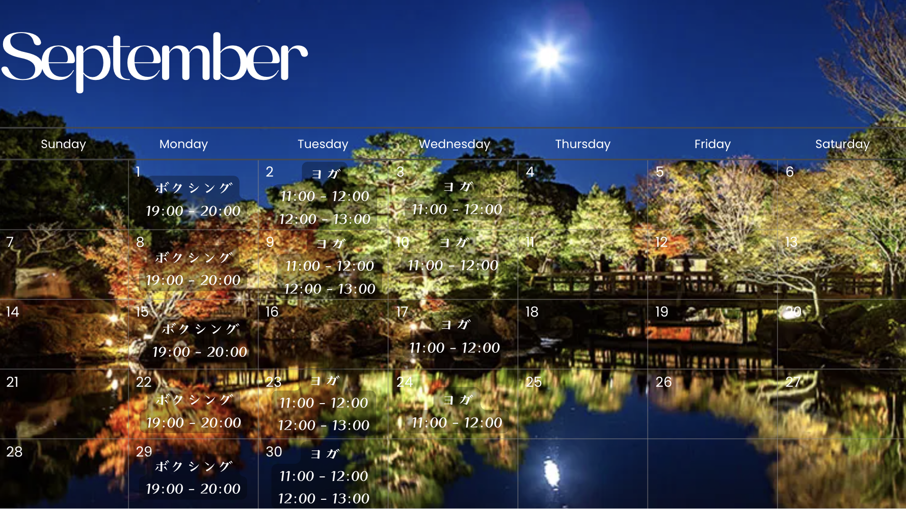 9月のグループレッスン・クラスのカレンダーを掲載します。