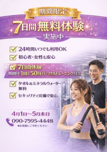 【期間限定🔥7日間無料体験】 2026.03.24 EVENT TOPICS 「ジム気になるけど不安…」 そんな方にピッタリ✨ ✔ 24時間いつでも利用OK ✔ 初心者・女性も安心 ✔ パーソナルトレーニング付き さらに👇 タオル&ミネラルウォーター無料! まずは気軽に体験してみませんか?😊 📅 4月1日〜5月末まで 📞 090-7595-4448 👉 お電話で受付中!